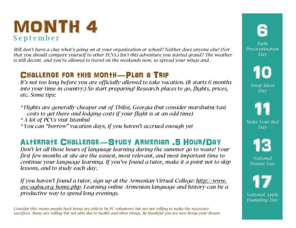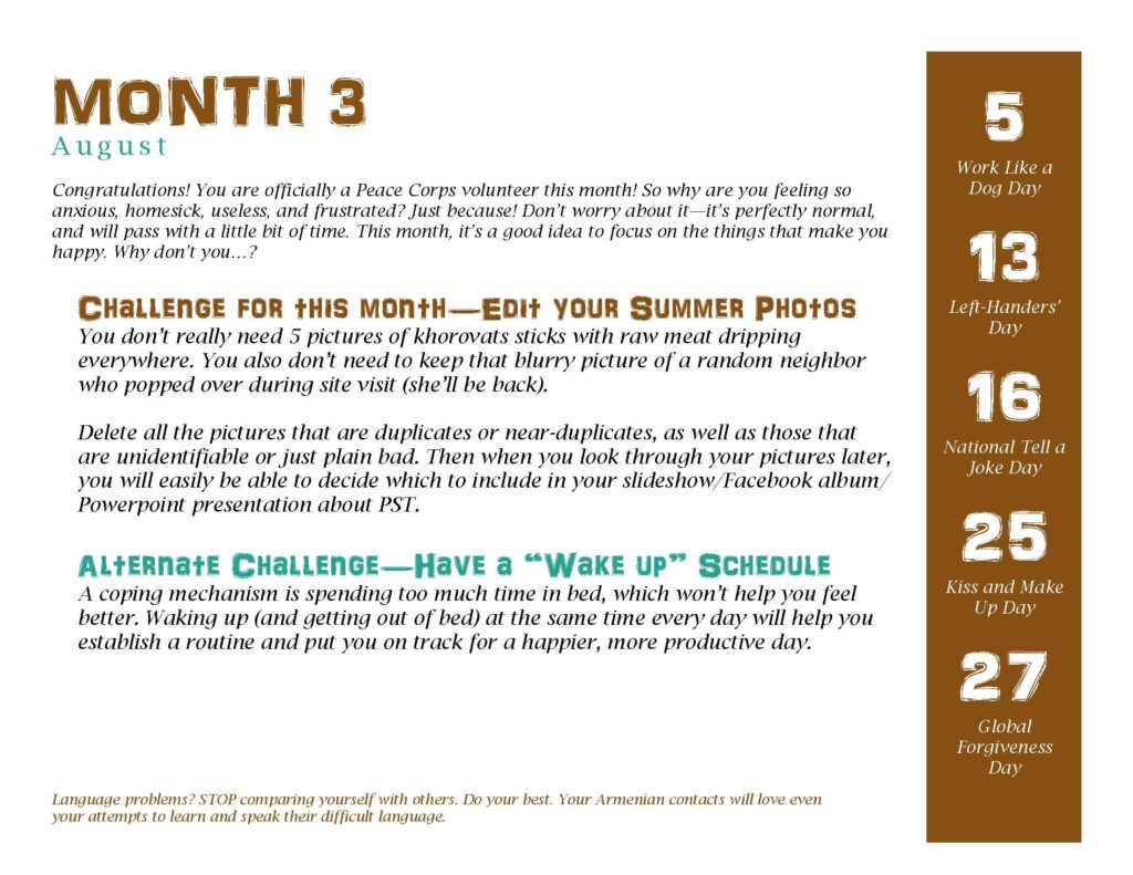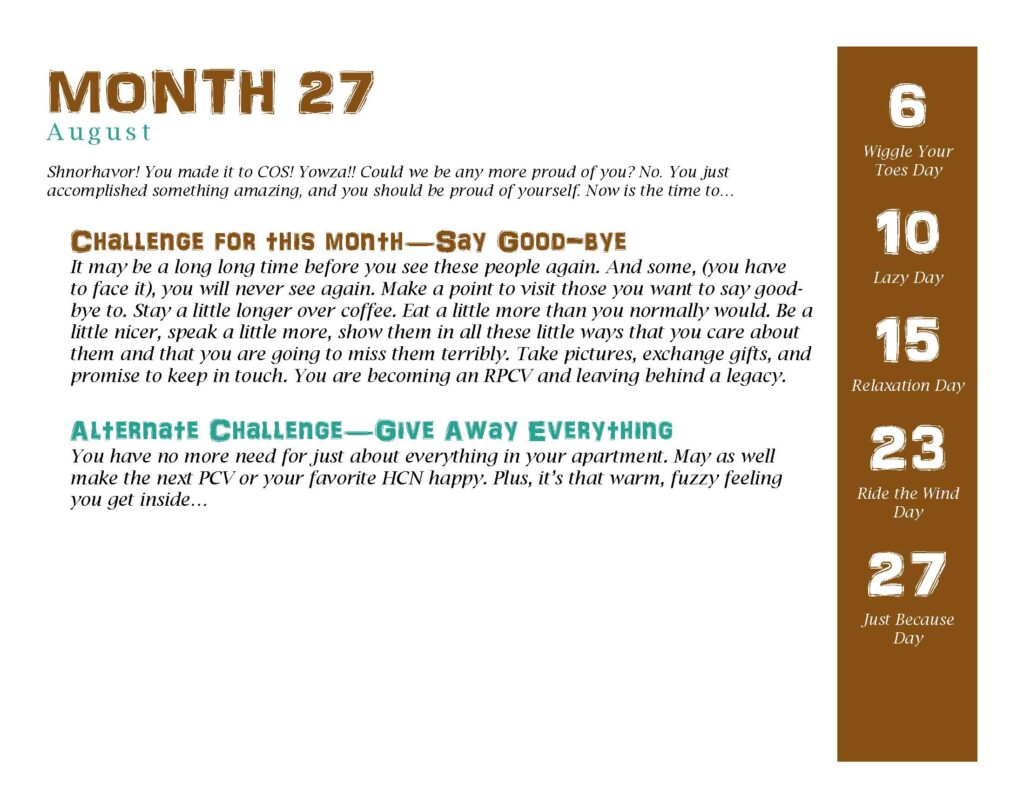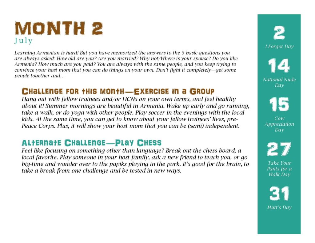Consider this an informal solution to your problems. It has tangible ideas for getting you out of your funk and spurring you to action. You can challenge yourself, and you can play along with the other PCVs in your group, pushing each other to achieve more and grow more, every single month.
