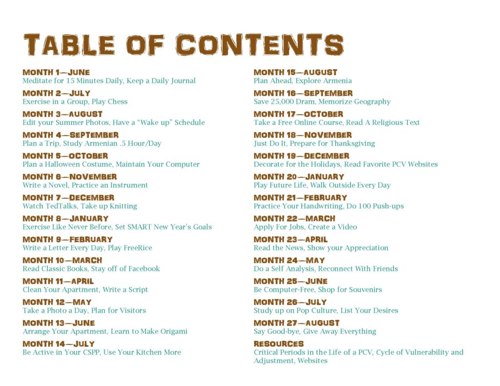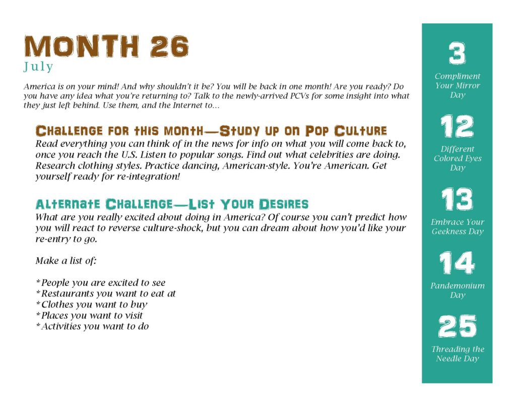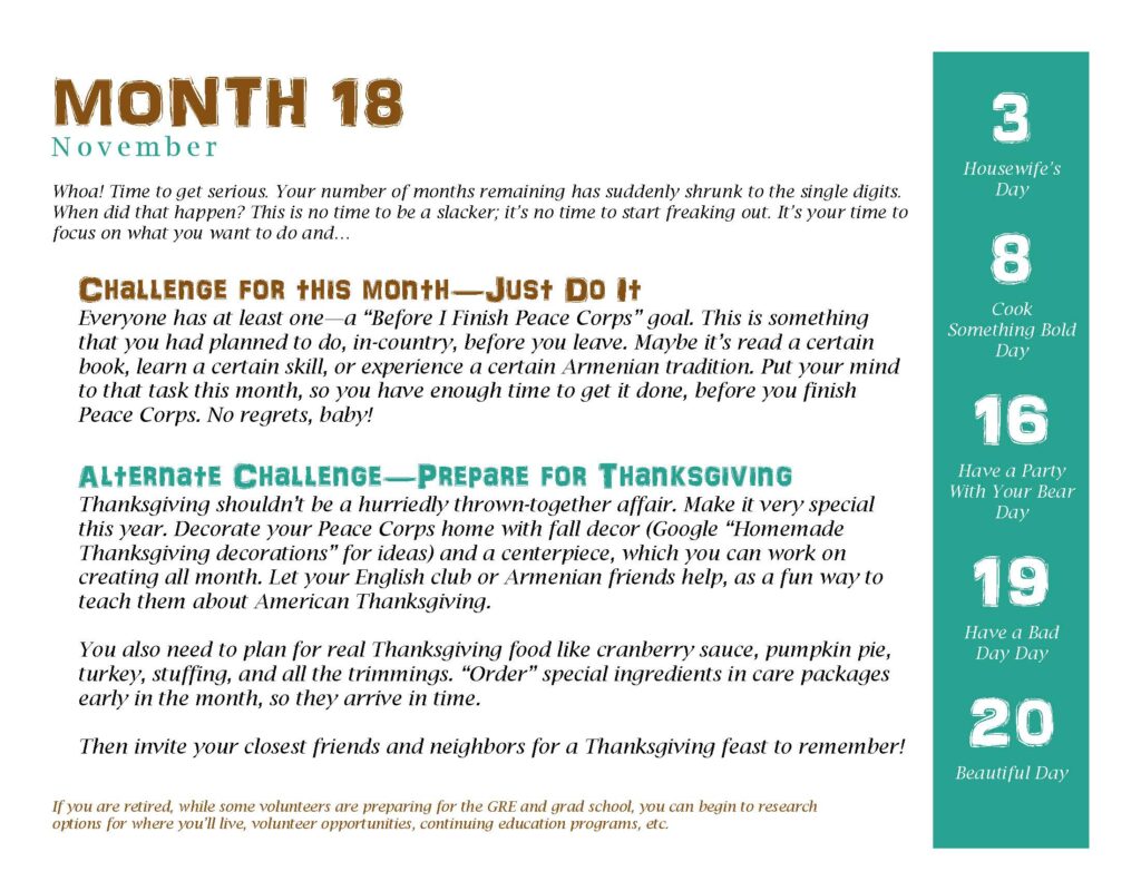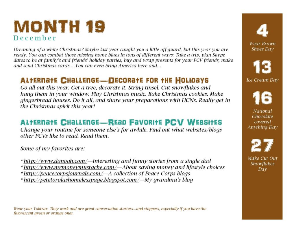 Consider this an informal solution to your problems. It has tangible ideas for getting you out of your funk and spurring you to action. You can challenge yourself, and you can play along with the other PCVs in your group, pushing each other to achieve more and grow more, every single month.